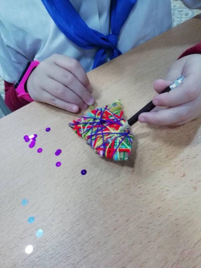 Motivados por la festividad los niños confeccionaron un arbolito de navidad utilizando cartón reciclado, hilos de colores de algodón, lentejuelas y canutillos, tapas de pomos plásticos y tallos herborizados de palmitas de agua.